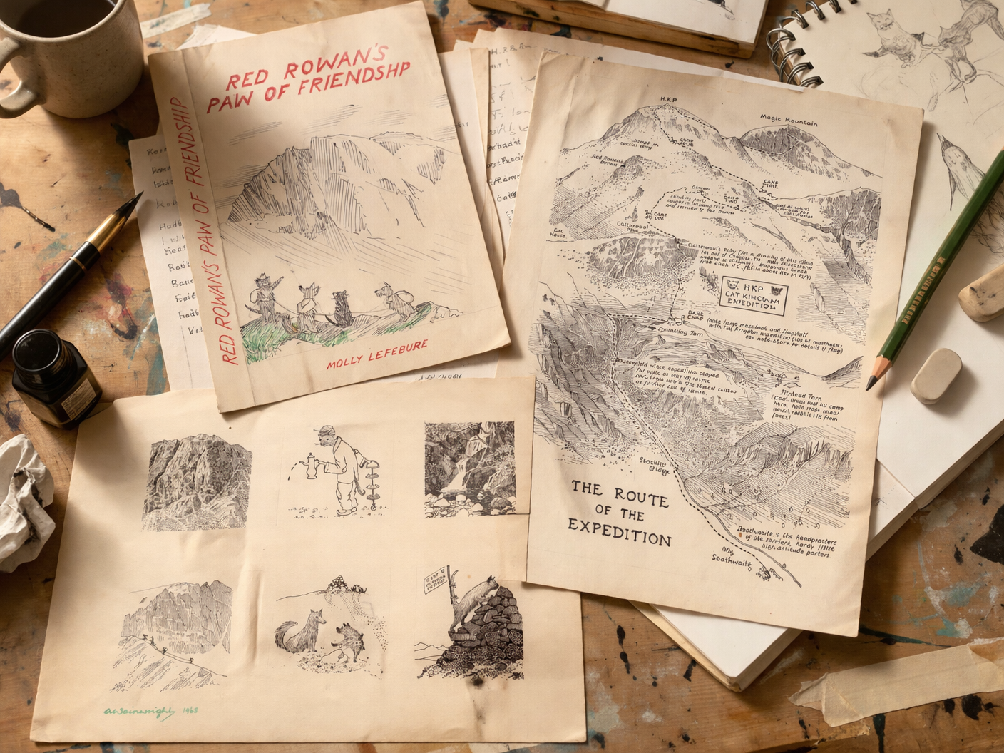 Selecting the illustrator proved straightforward. Alfred Wainright had long been close friends with Molly Lefebure, united by their shared enthusiasm for mountaineering, the Lake District, and a mutual fondness for cats. Their friendship began through correspondence after Molly contacted him about a small mistake in one of his guidebooks, and it quickly grew from there.